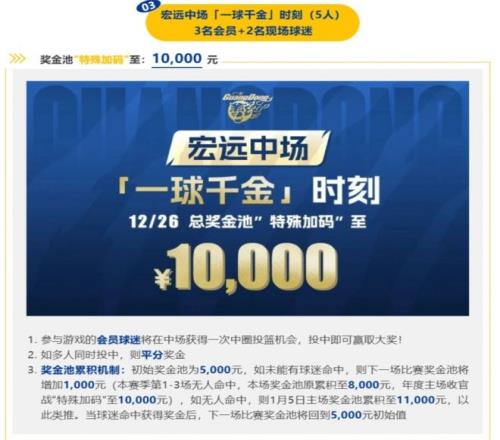 在比赛中场休息的时候,将会有五名球迷参加本次活动,只要球迷在中场投进一记超远三分球,那么,就直接可以带走10000元的奖金。虽然,只有一次机会,难度系数很高。然而,篮球是圆的,一切皆有可能。只要您参加,也许,这10000元奖金就是您的。