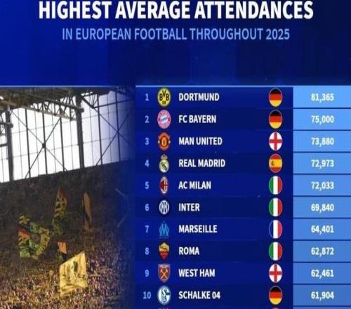 2025年欧洲俱乐部场均上座人数:多特、拜仁、曼联前三